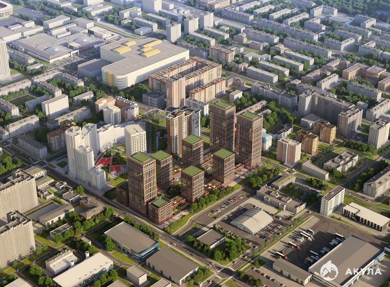 Зона ритейла занимает два этажа стилобата. В отличие от других проектов компании, ее активный фронт (вывески, витрины, летние террасы) обращен не на улицу, а внутрь застройки. Здесь Брусника организует общественное пространство с площадью, фонтаном и пешеходной аллеей. Оно будет доступно всем жителям города.