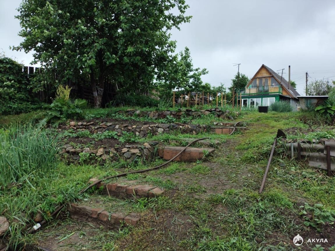 Площадь земельного участка 17, 5 соток. Участок двухуровневый (примерно 9 соток верхняя ровная часть, соединённая лестницей и каскадами грядок вниз к остальной ровной части участка).