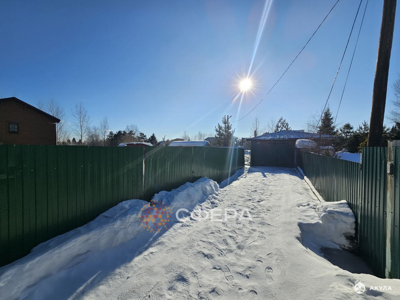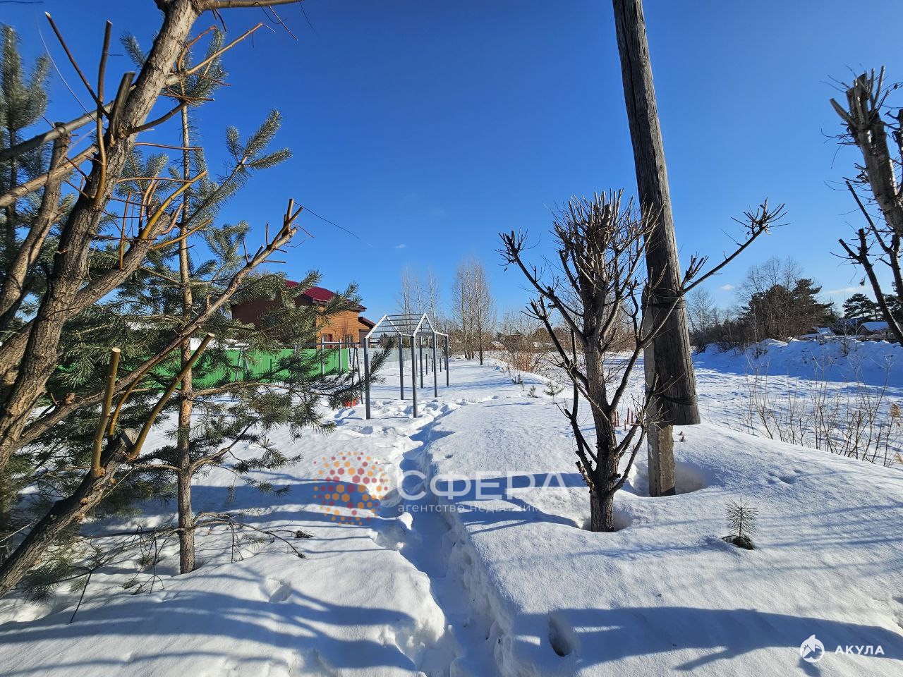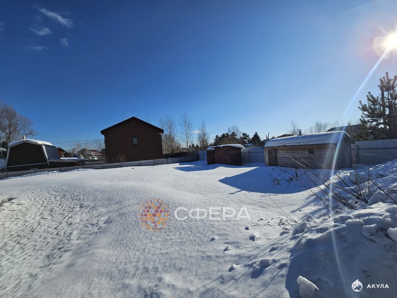 Участок: Ровный, идеально квадратный, возвышенный над уровнем местности, окружён спокойствием тихой тупиковой улицы.