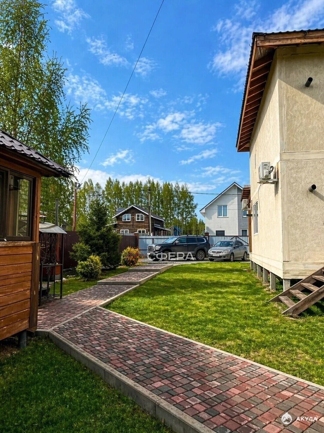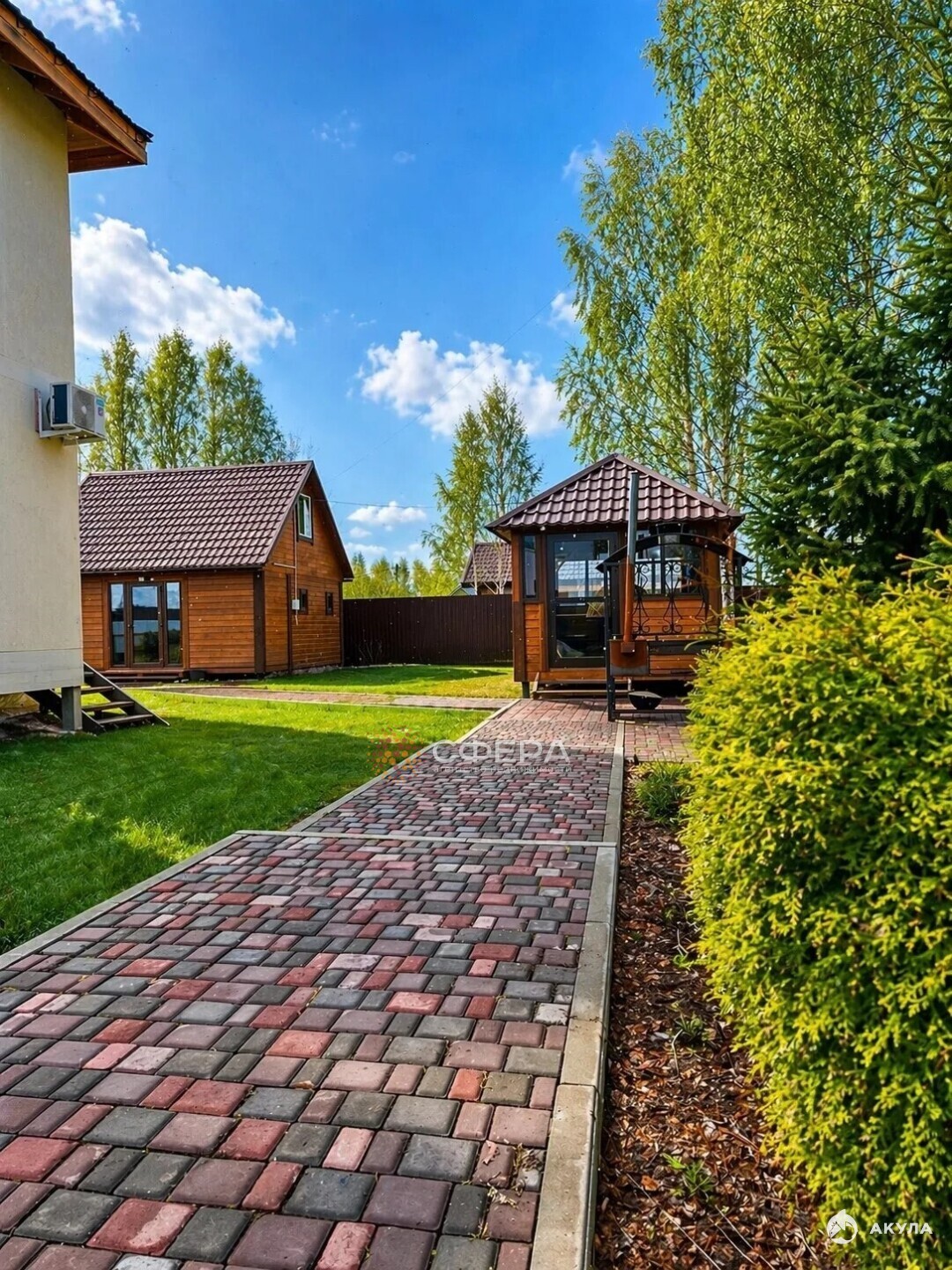 Посадки: газон, туи, ели, березы, смородина.