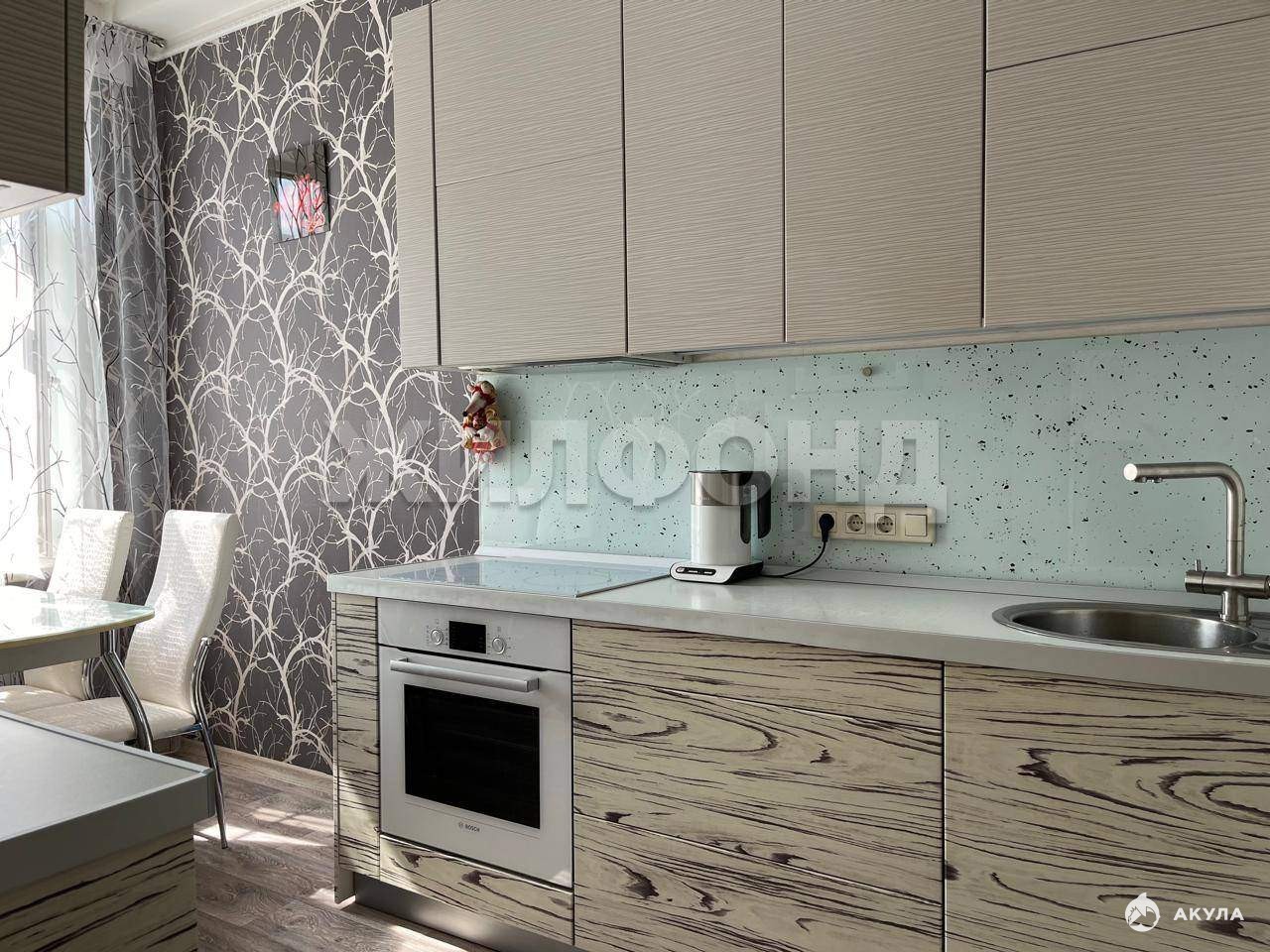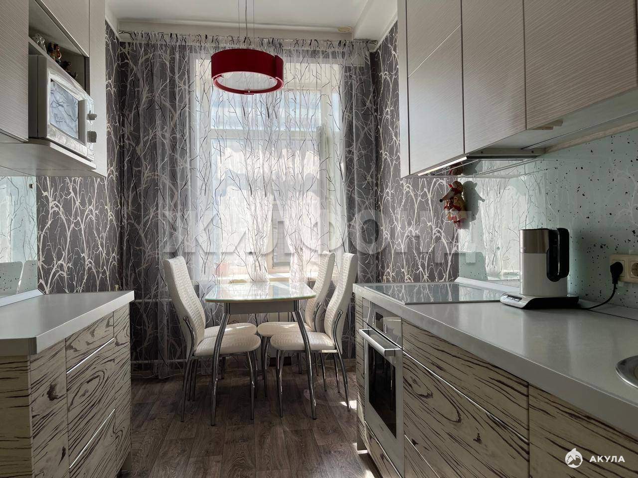 Кухонный гарнитур с качественной немецкой фурнитурой (производство Blum) , встроенная вытяжка Fаbеr, ящики и двери пуш-ап, две зоны освещения (центральная часть и над обеденной зоной) . Рабочая зона подсвечена, фартук над рабочей зоной из закалённого стекла. Смеситель и мойка - производитель Оmоikiri. Четырехступенчатая система очистки воды Аквафор, подача чистой воды через кухонный смеситель. Обеденная зона - стеклянный стол, 4 мягких стула с удобной высокой спинкой.