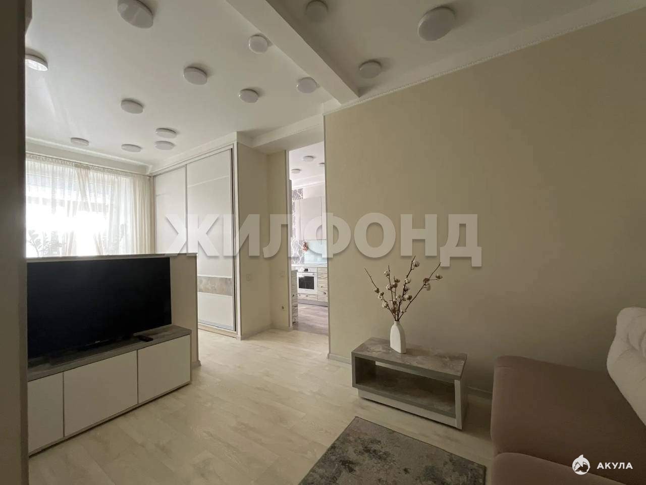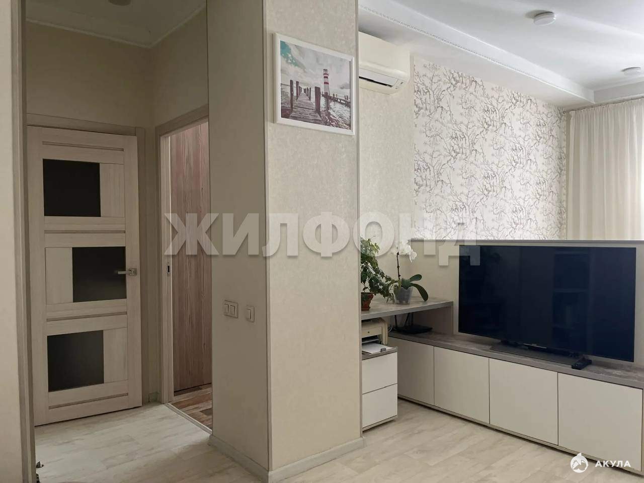 В гостиной: угловая тумба с выкатными ящиками на пуш-ап, кондиционер (производство Dаikin) , диван (размер 1, 8 х 2 метра) , который раскладывается в комфортное большое спальное место.