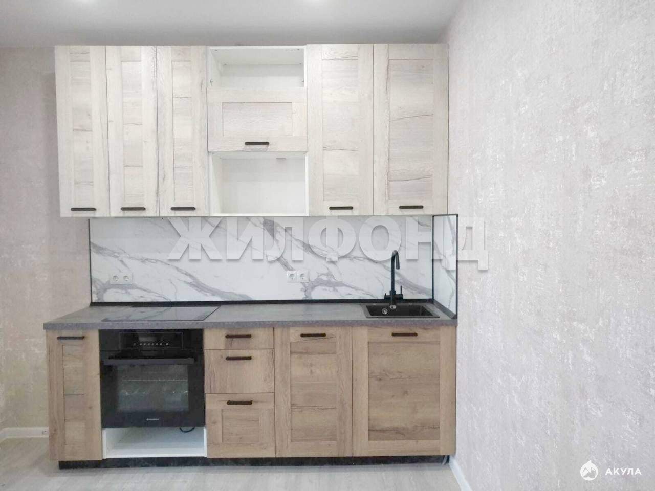 -на кухне установлен вместительный гарнитур со встроенной техникой.