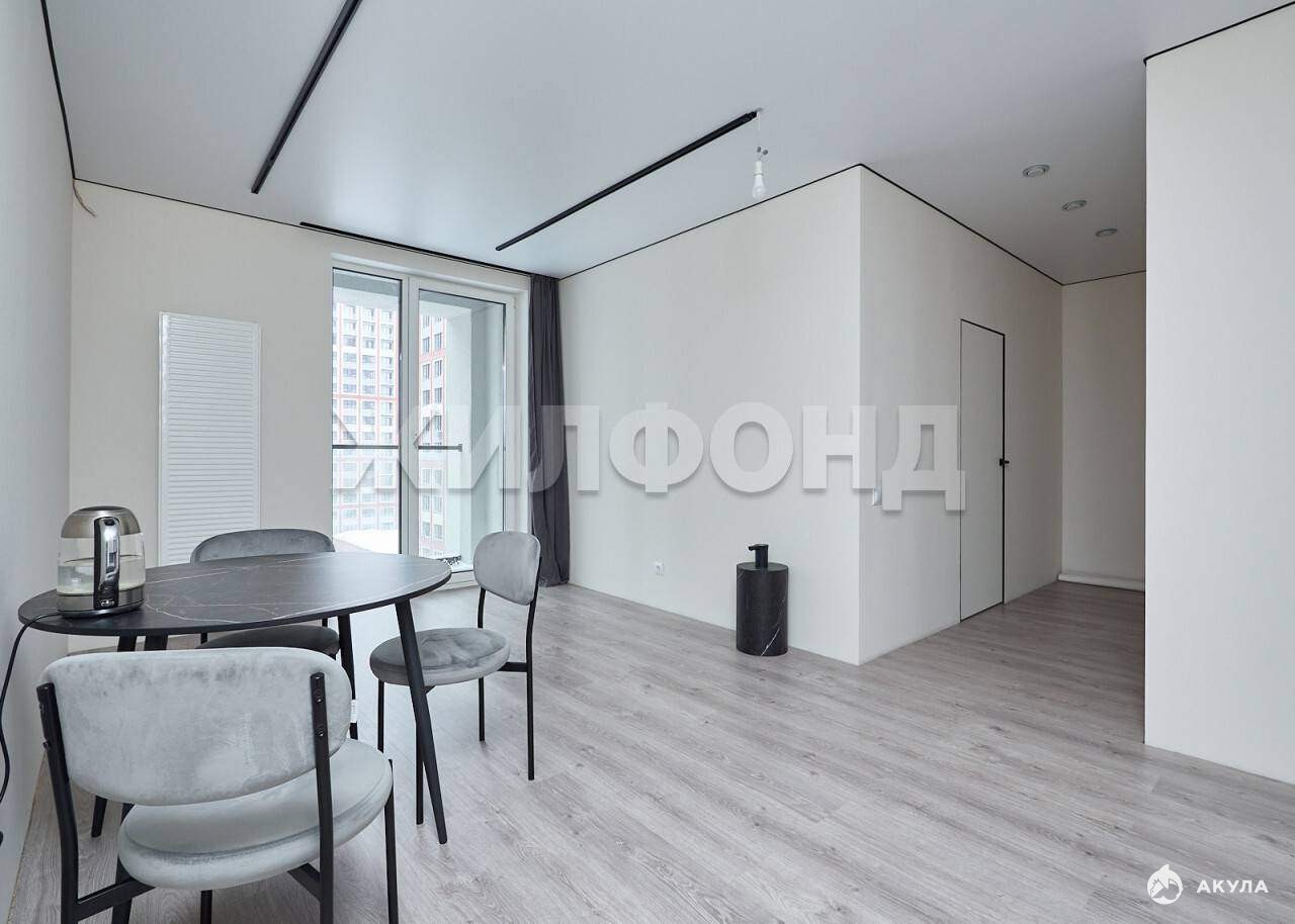 Ремонт выполнен в спокойных тонах с применением качественных материалов. Панорамные окна расширяют пространство.