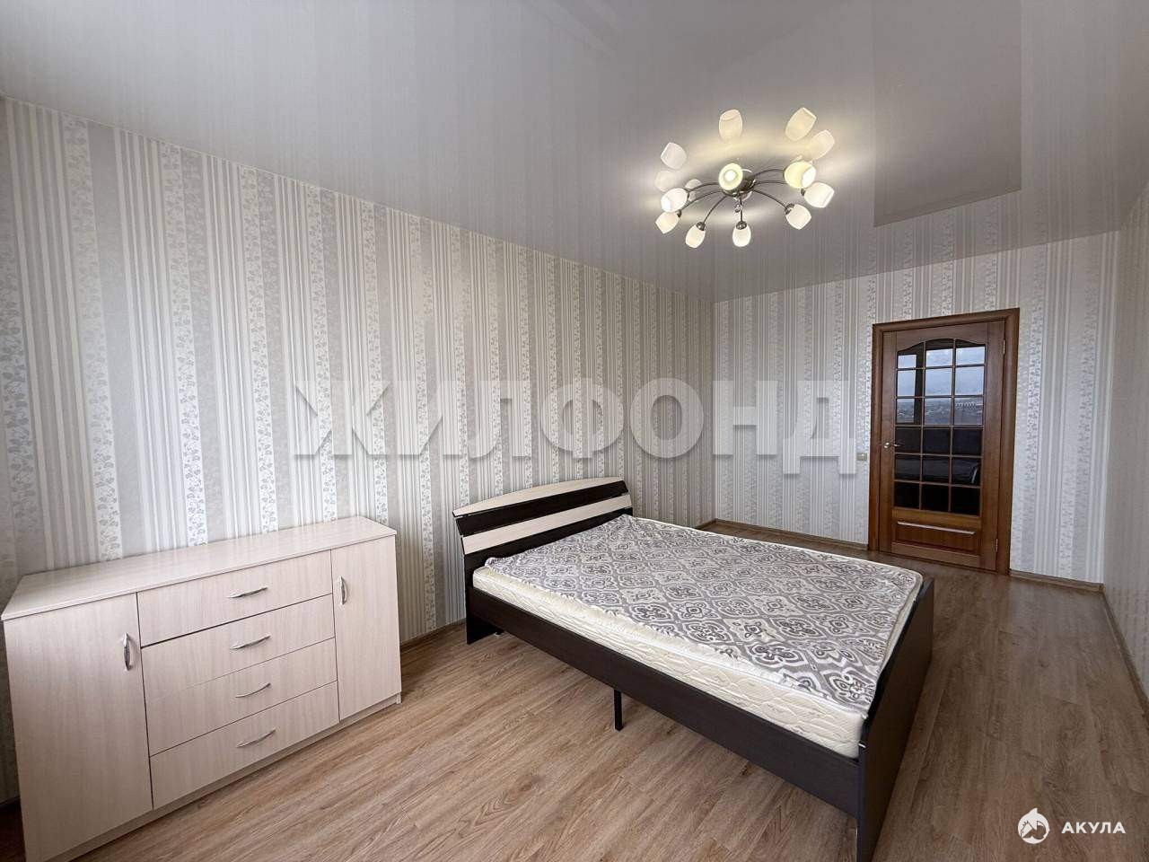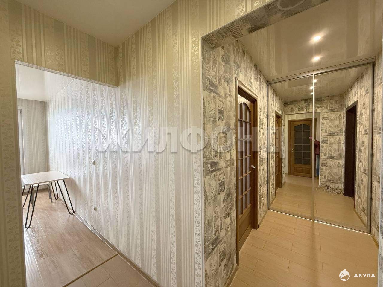 В квартире выполнен ремонт: на полу ламинат, стены выровнены и наклеены обои, потолок натяжной, в санузле кафель, балкон остеклен и обшит рейкой.