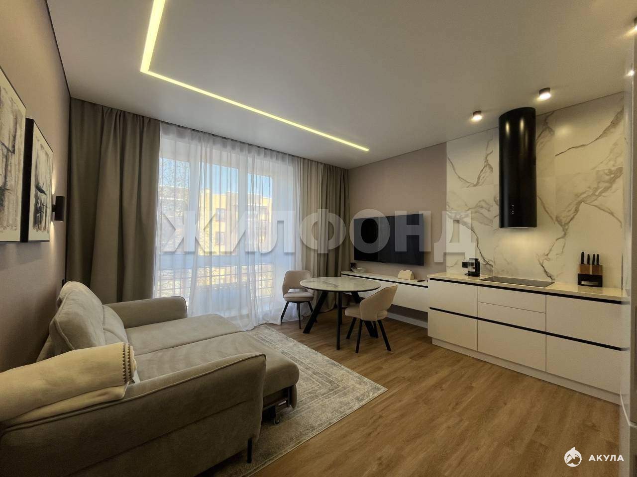 Готовый интерьер: Светлый евроремонт в бело-серых тонах с панорамными окнами.