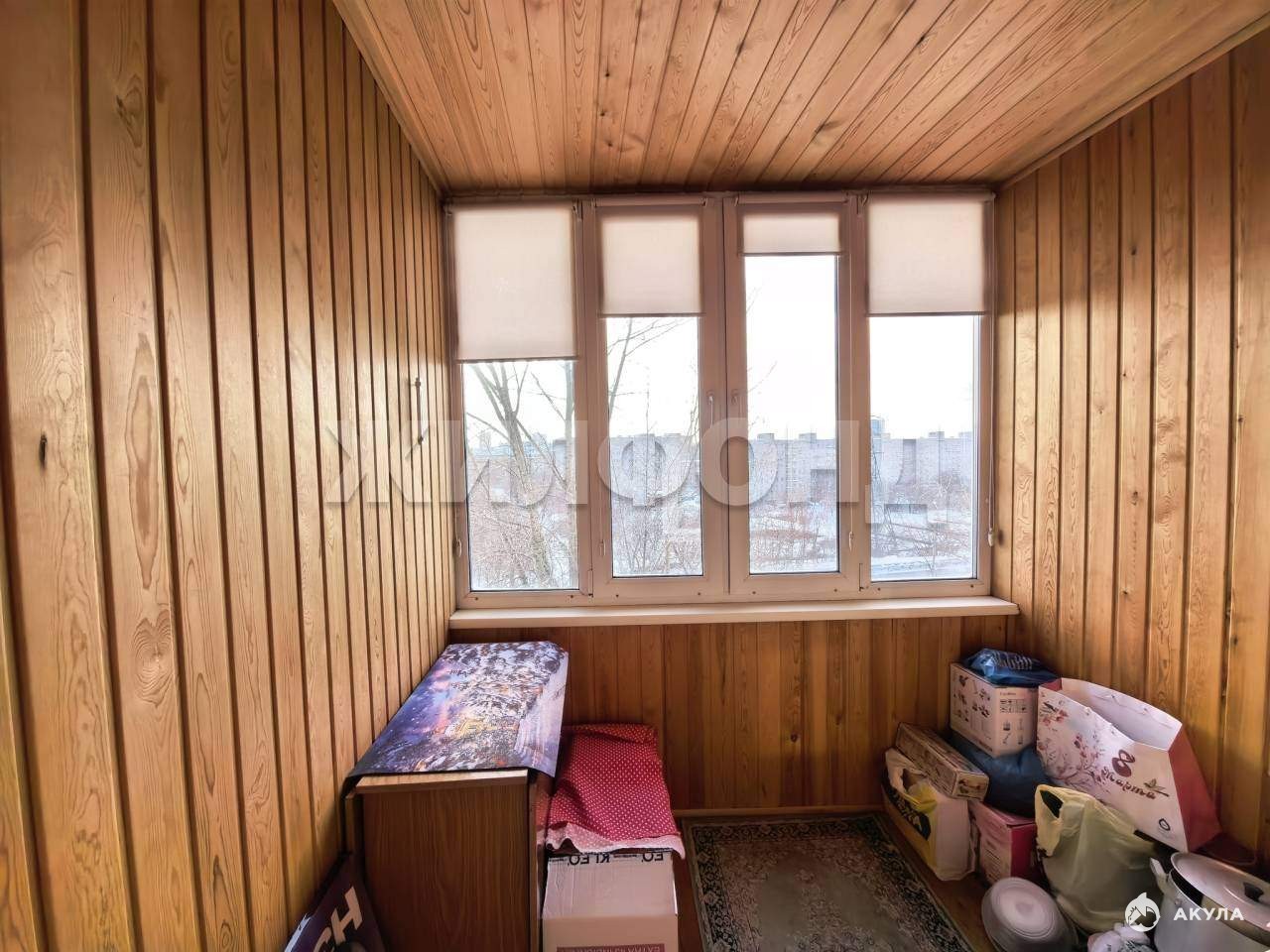 Лоджия утеплена, отделка деревянными рейками.