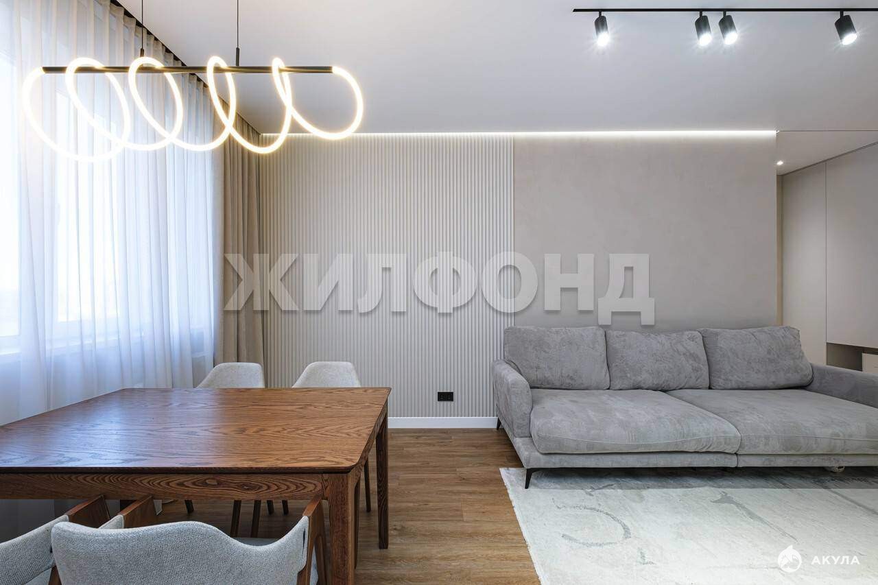 Высокие натяжные потолки , со встроенными треками и подсветками на теневых профилях, акцентные формы светильников. Здесь нет случайного света, только продумнные сценарии освещения!