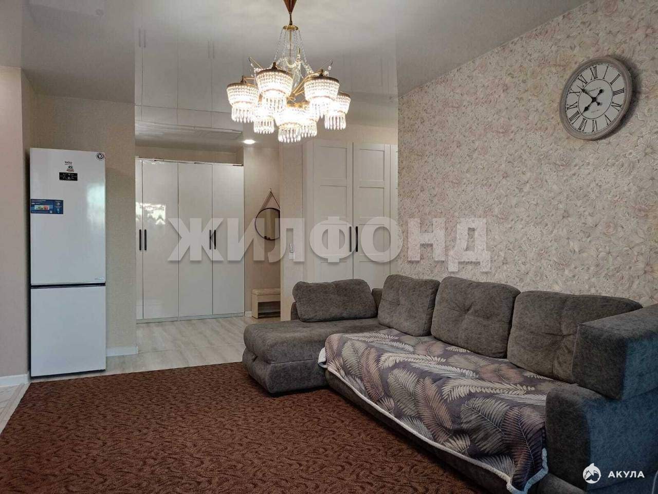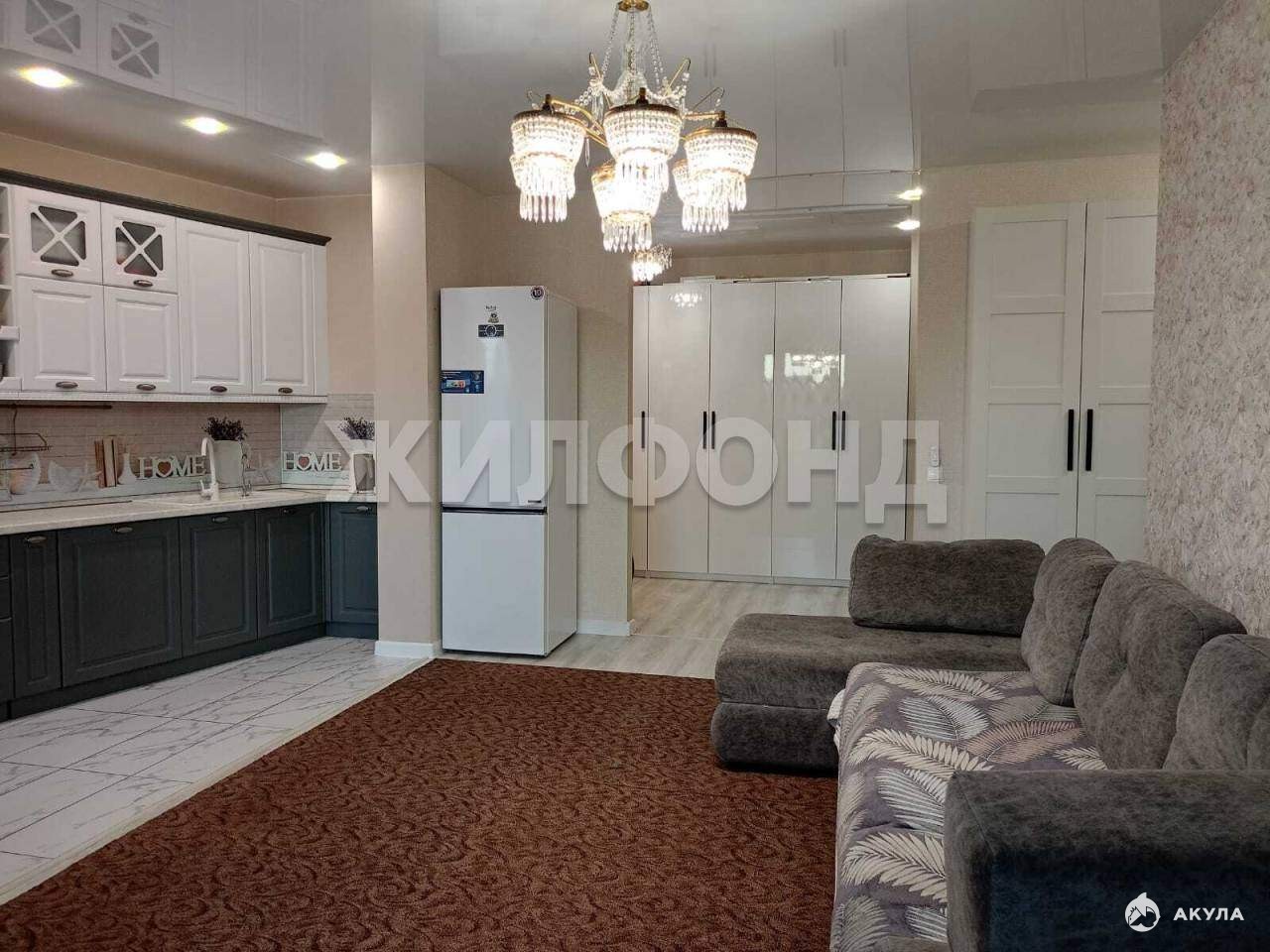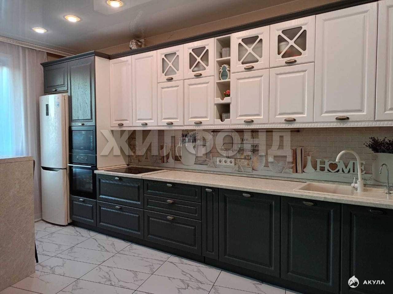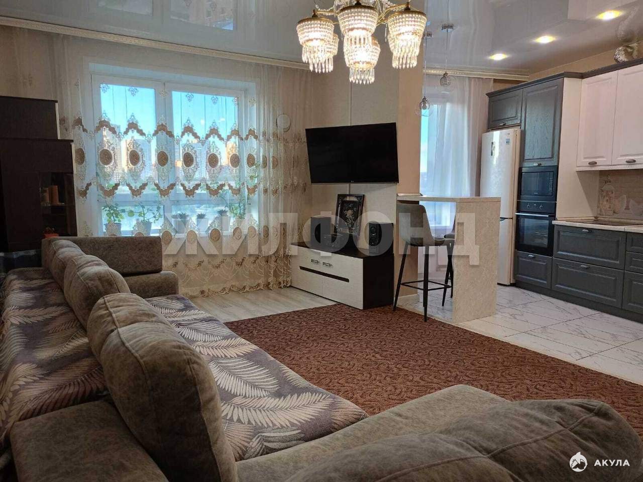 Во всей квартире ремонт выполнен в светлых тонах, натяжные потолки, ламинат 33 класса, в зоне кухни и санузлах на полу выложена плитка, стены в санузлах обшиты панелями, за счет чего встроены вместительные хозяйственные ниши. В кухне-гостиной установлена барная стойка, есть ниша для установки дополнительной морозильной камеры. Стены оклеены качественными обоями. Новым собственникам остается: кухонный гарнитур и встроенная в него бытовая техника, частично остается мебель из детских комнат и коридоров.