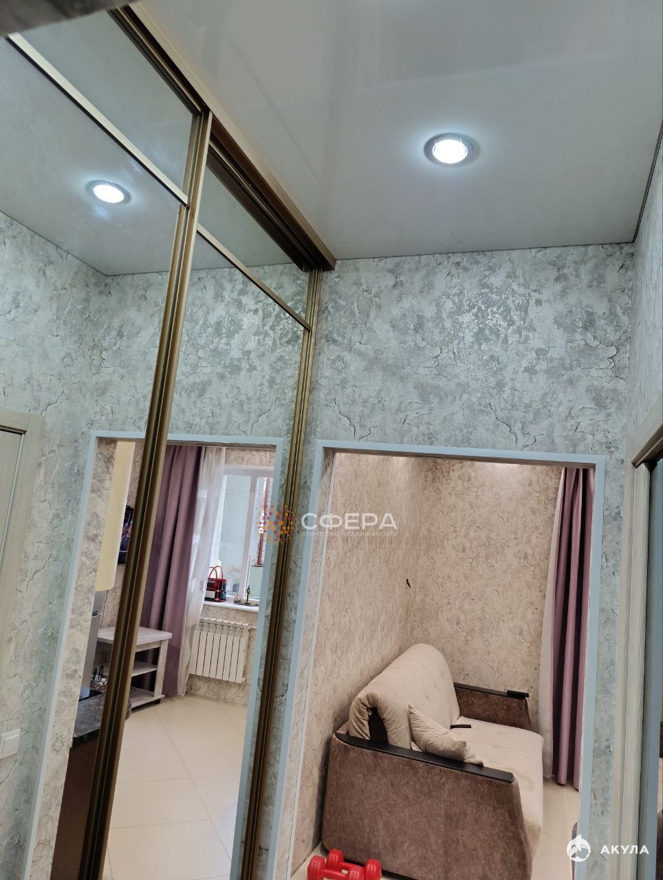 В коридоре, встроенный шкаф с зеркальными дверьми.