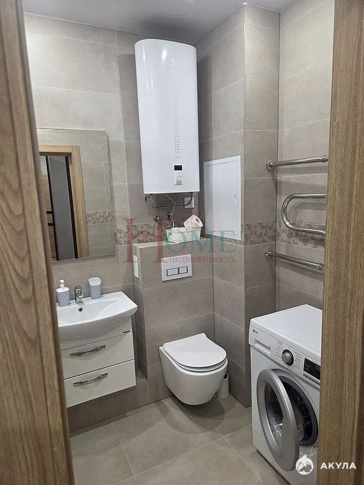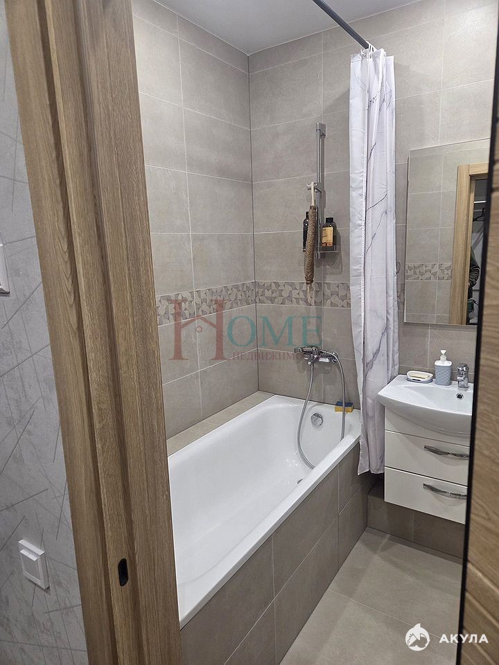 Кухня оборудована современной техникой, включая холодильник и плиту, что позволяет готовить без лишних хлопот. Ванная комната совмещена и оснащена всем необходимым, включая стиральную машину.