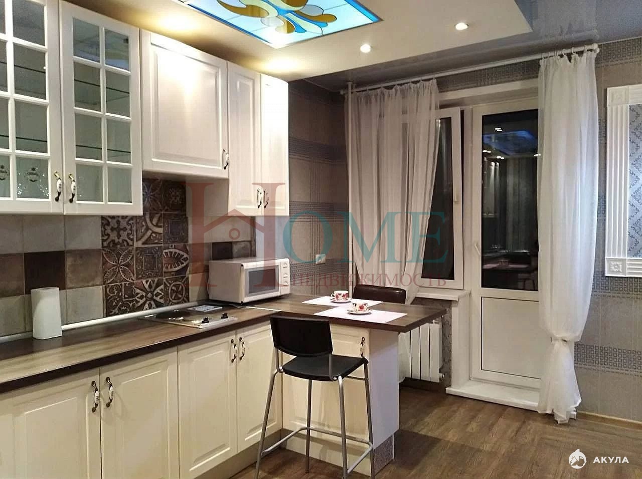 Кухня с техникой, витражные потолки, большая светлая лоджия, 2-сп кровать и раскладной диван. Есть телевизор, подключен интернет. В прихожей большая гардеробная.