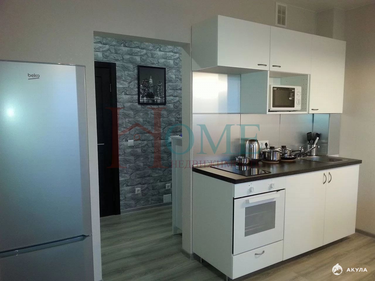 Кухонный гарнитур с необходимой бытовой техникой: холодильник, микроволновая печь, варочная панель и духовой шкаф.