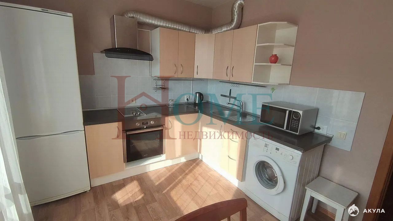 Кухня оснащена необходимой бытовой техникой: холодильником, плитой, духовкой, микроволновой печью и стиральной машиной.