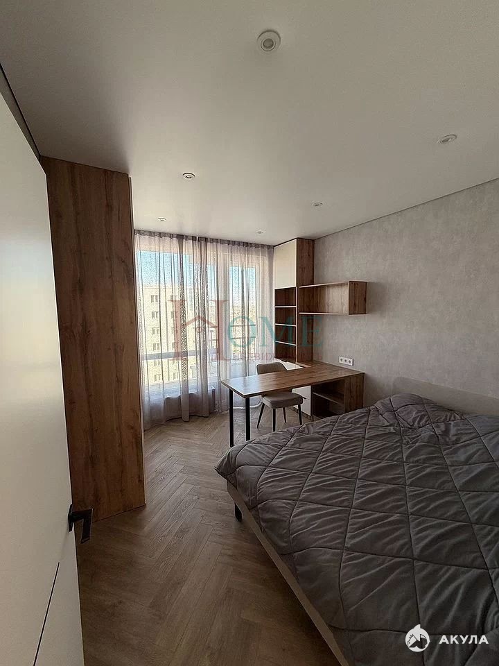 В спальне — большая кровать и рабочая зона с письменным столом.
