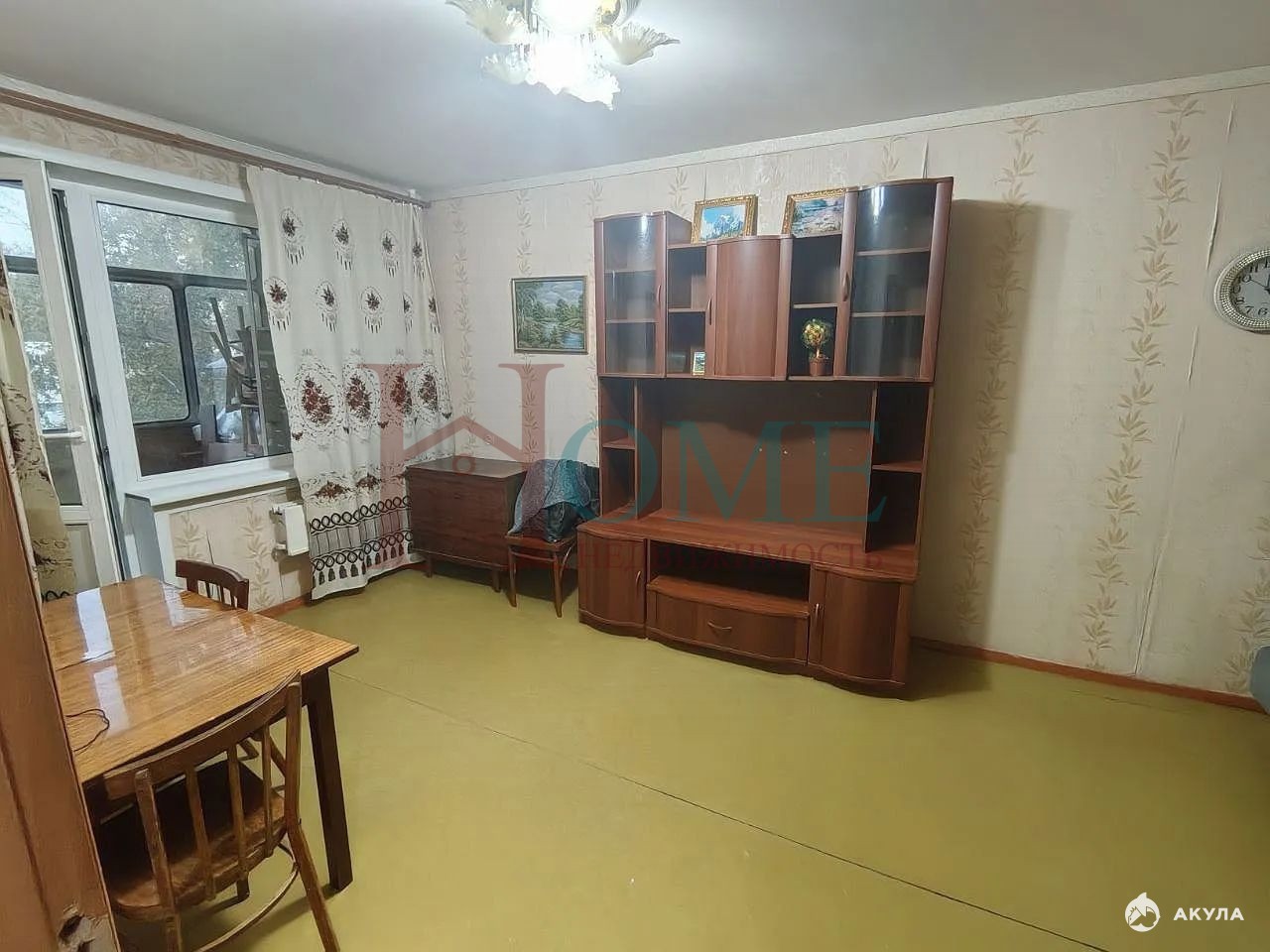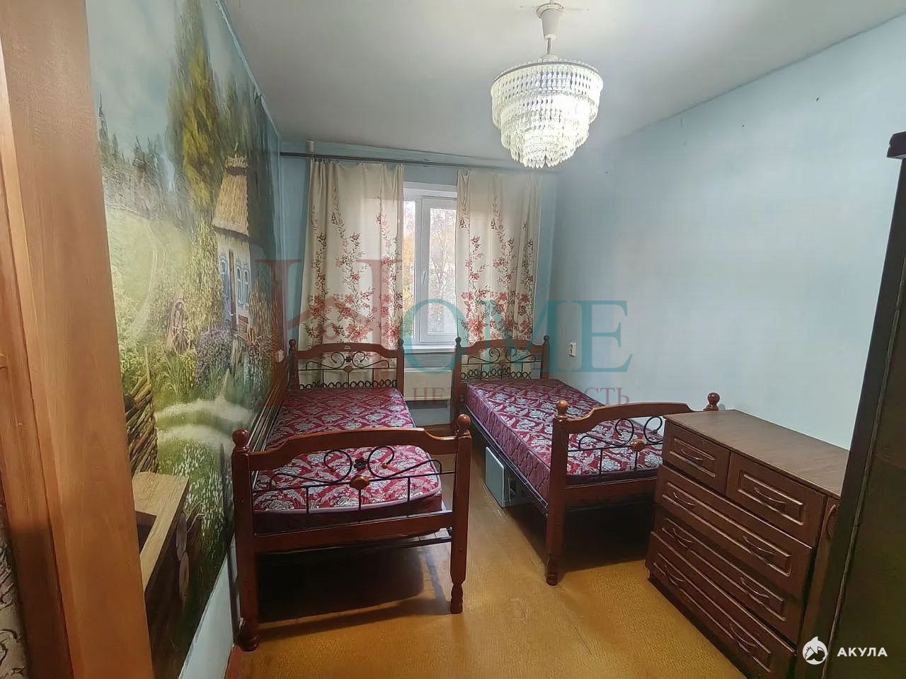 В зале диван, в детской две кровати, которые можно трансформировать в двухярусную. Школа под окном. Метро 5-7 минут пешком. Соседи тихие.