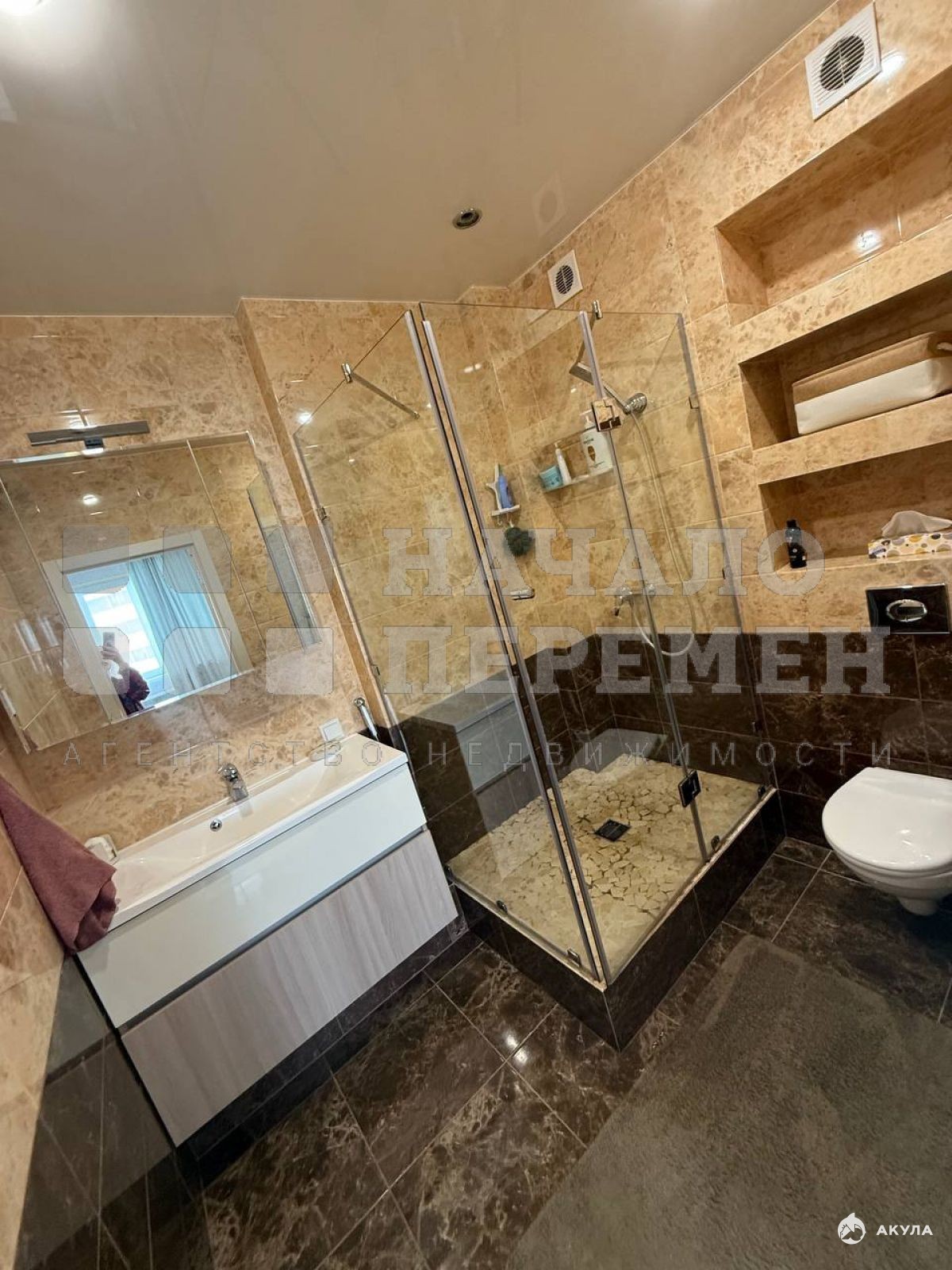 В квартире 2 совмещённых санузла. Один с душевой кабиной, а другой с ванной.