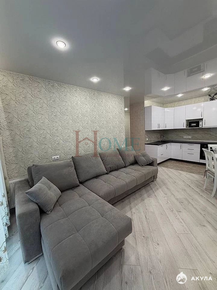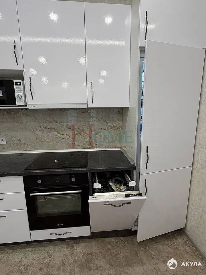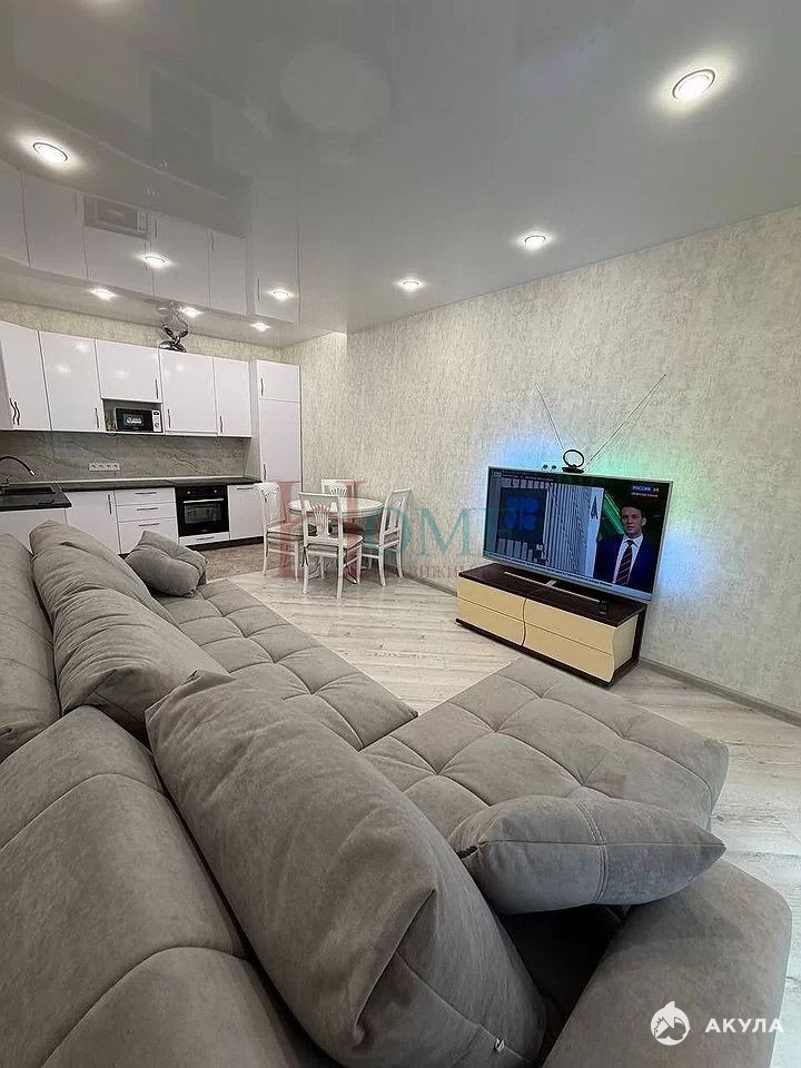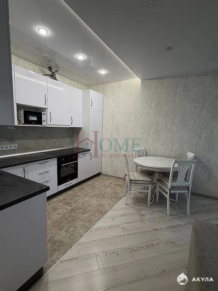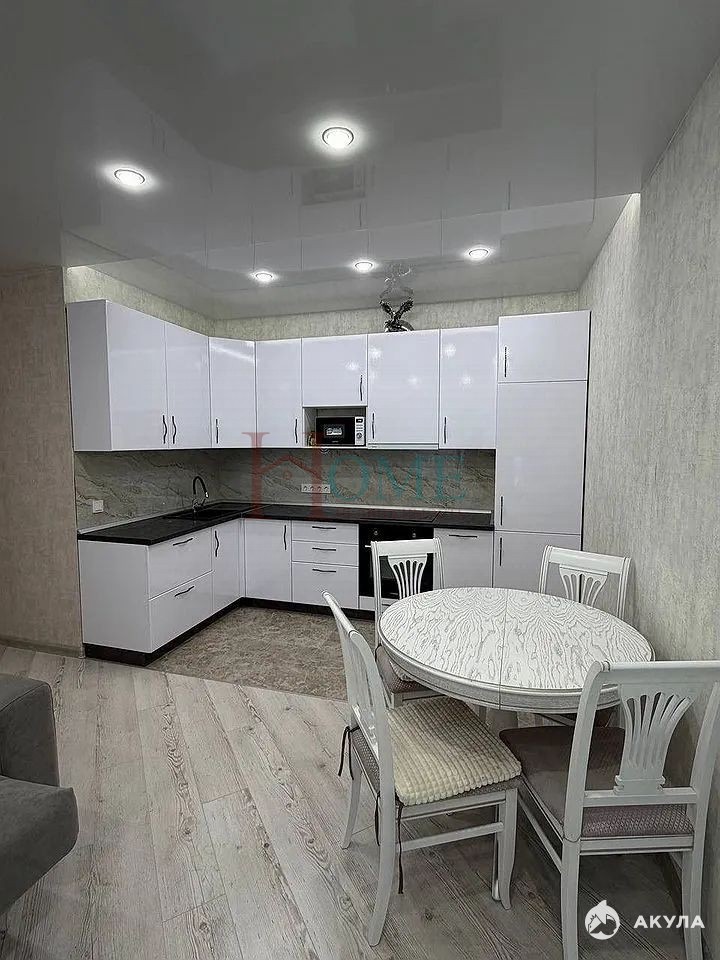 Кухня впечатляет своим объемом — 20 квадратных метров, оборудована всей необходимой техникой, включая холодильник, микроволновку и посудомоечную машину. В гостиной установлен большой угловой диван и телевизор, а также обеденный стол со стульями.