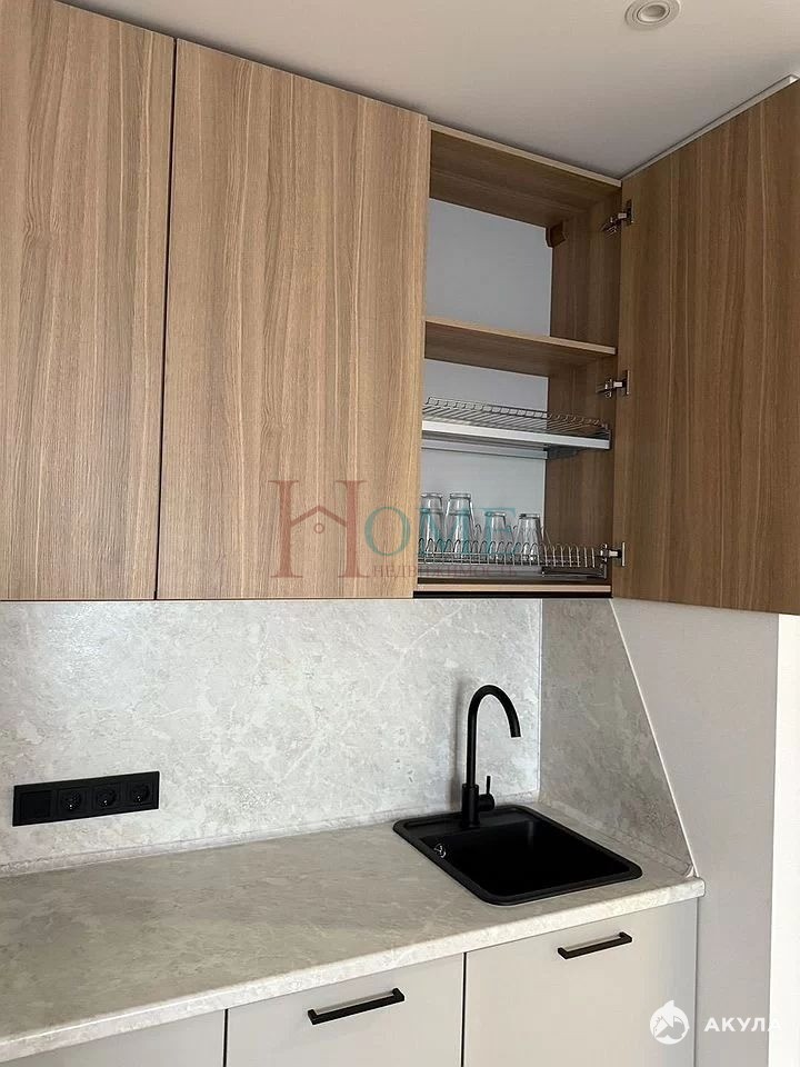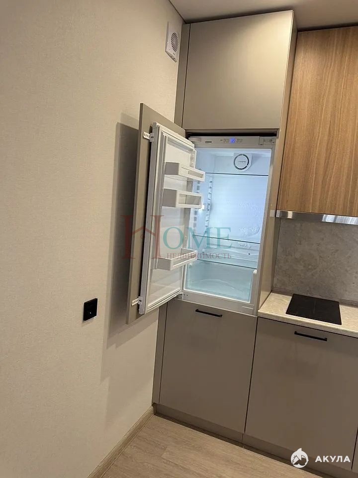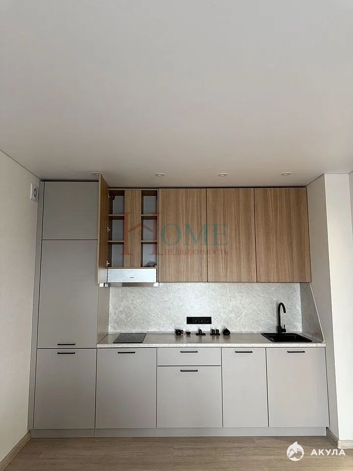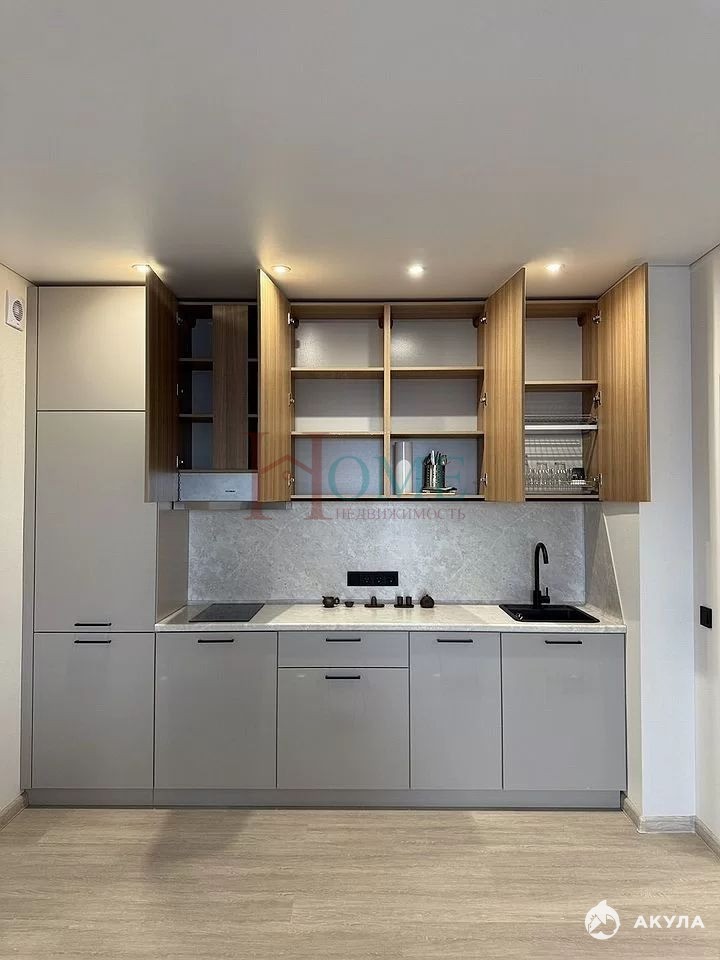 Удобная кухня с широкой рабочей поверхностью, встроенным холодильником и черной мойкой не оставит вас равнодушным