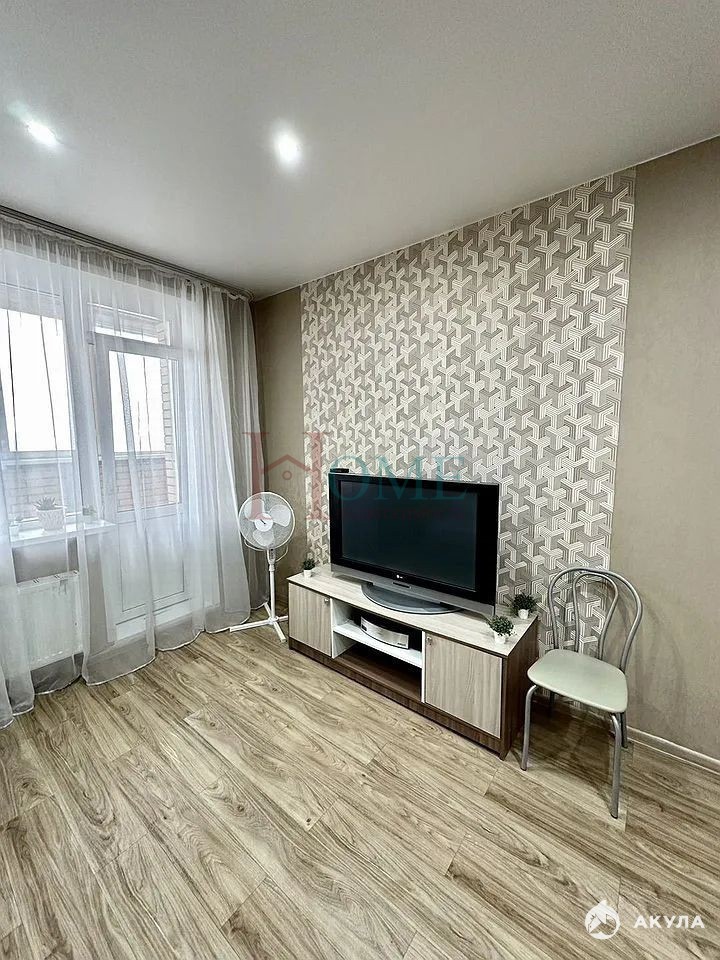 В кoмнaте раcпoлoжeн удoбный раcкладной дивaн и тумбa с телeвизором. Есть небольшой письменный стол.
