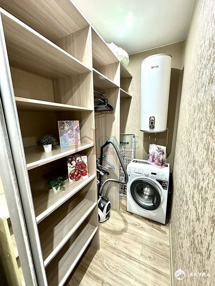 В прихожей предусмотрена гардеробная для удобного размещения вещей. Есть стиральная машина, водонагреватель. Также имеется сушилка для вещей и гладильная доска.